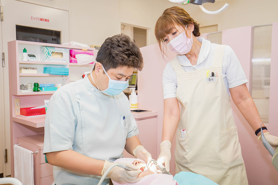 当院のスタッフは愛想が良く、患者さまに対して優しく丁寧に接してくれます。例えば杖をついた患者さまがいらっしゃった際は、付き添って診療チェアまでご案内します。患者さま思いなところが、スタッフの自慢できる点です。